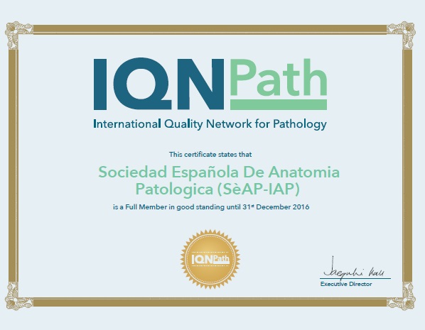 Nuestro programa de calidad, Garantía de Calidad en Patología (GCP) de la Sociedad Española de Anatomia Patológica, ha sido nombrado miembro de la red internacional de programas de calidad en Patología IQNPath (International Quality Network in Pathology que integra los grandes programas de calidad como UKNQAS, NordiQC y otros para ofrecer una mejora en la aplicación clínica de los biomarcadores basados en secciones de tejidos. Esta es una oportunidad única para dar a conocer nuestro programa internacionalmente, intercambiar conocimientos entre los líderes de opinión en el campo, aunar recursos para establecer rápidamente las recomendaciones para la adopción de nuevos biomarcadores, establecer puntos de referencia y mejores prácticas. La interacción entre expertos internacionales y los diferentes actores involucrados en la evaluación de la calidad es un modo clave para apoyar una adopción más rápida de nuevos biomarcadores y tecnologías. A través del consorcio, la SEAP desarrollará e implementará programas de NGS, biopsia líquida y PDL1, incorporando patólogos que colaboran en el programa en los diferentes grupos de trabajo.