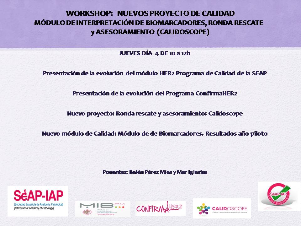 - NUEVOS PROYECTOS DE CALIDAD EN PATOLOGÍA MAMARIA: Módulo de Interpretación de Biomarcadores, Ronda de Rescate y Asesoramiento (mañana).